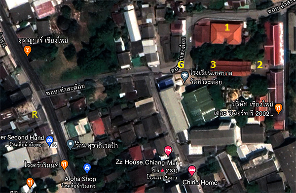 ชื่อวัดตั้งตามชื่อหมู่บ้านสะต๋อยซึ่งมีท่าน้ำลงแม่น้ำปิง วัดตั้งอยู่ไม่ไกลท่าน้ำ จึงเรียกกันว่า "วัดท่าสะต๋อย" ผมรู้จักมาตั้งแต่เด็กแล้วล่ะ วันนี้คนเฒ่าได้มีโอกาสเข้ามาเก็บภาพให้เพื่อน ๆ จากถนน (R) เชียงใหม่-ลำพูน (เลียบแม่น้ำปิง) เลี้ยวเข้าซอยท่าสะต๋อย ขี่จักรยานผ่านประตูทางเข้า (G) ตรงไปในวัด...
